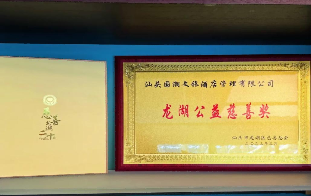 会上,汕头市龙湖区区委常委陈泽波宣读《龙湖区慈善总会关于授予企业(个人)荣誉称号的通报》。中国·350vip浦京集团旗下汕头国潮文旅酒店管理有限公司(DIOTEL潮酒店)在本次大会上荣膺“龙湖公益慈善奖"称号,并受颁发奖牌。